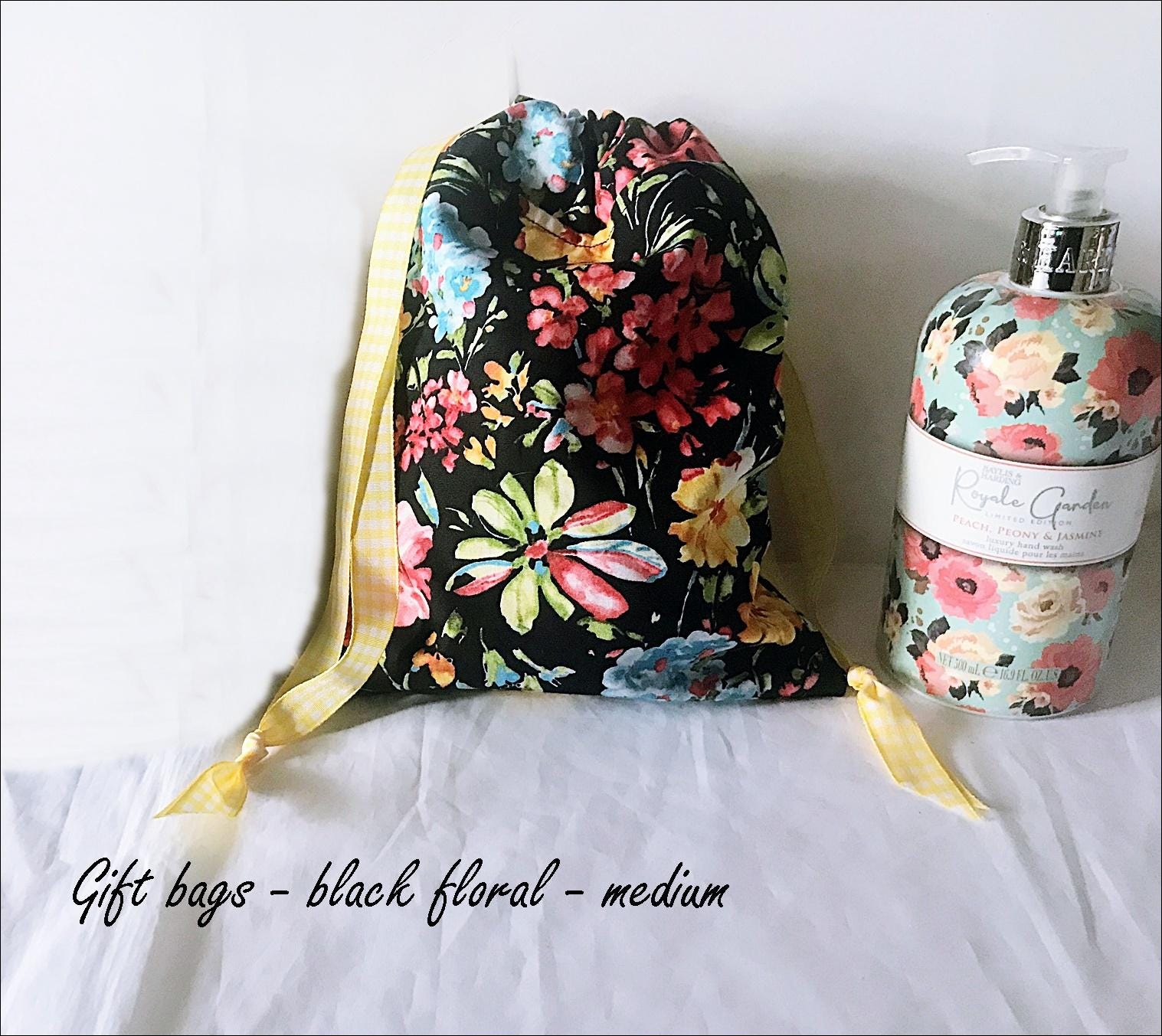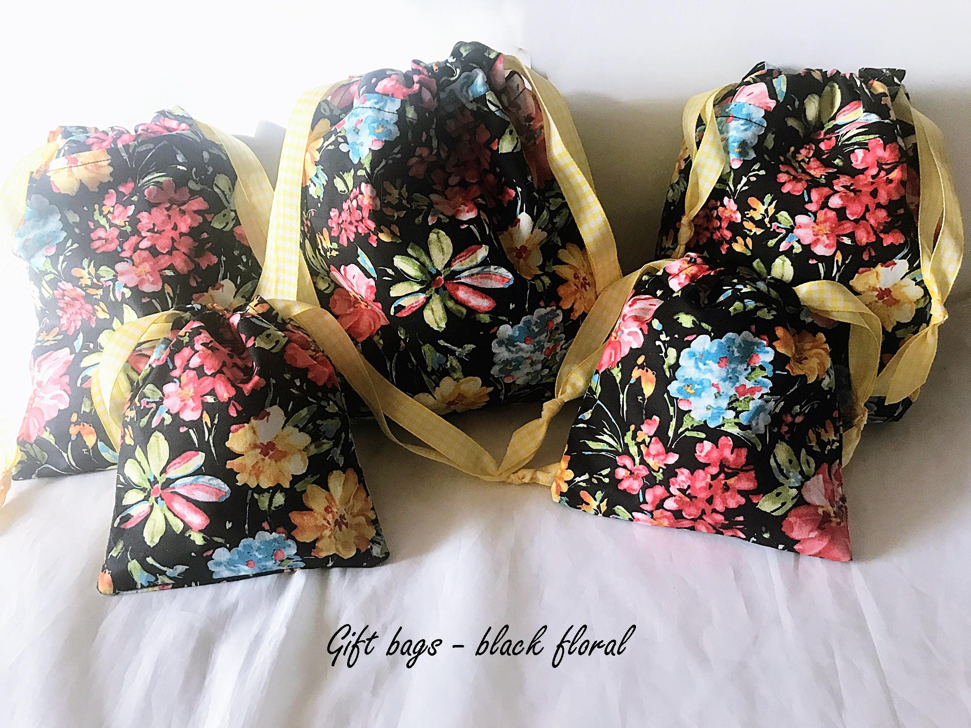 Black floral gift bags, with ribbon drawstring and lined in black cotton fabric.