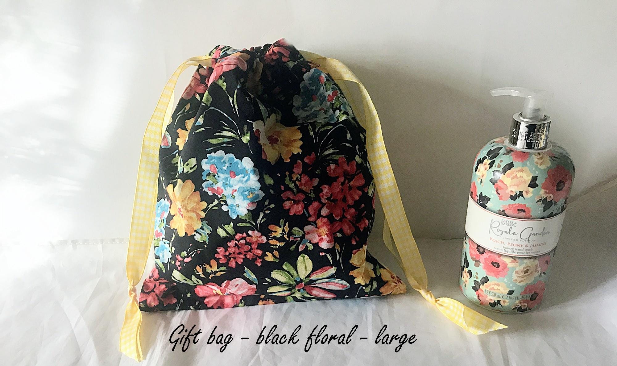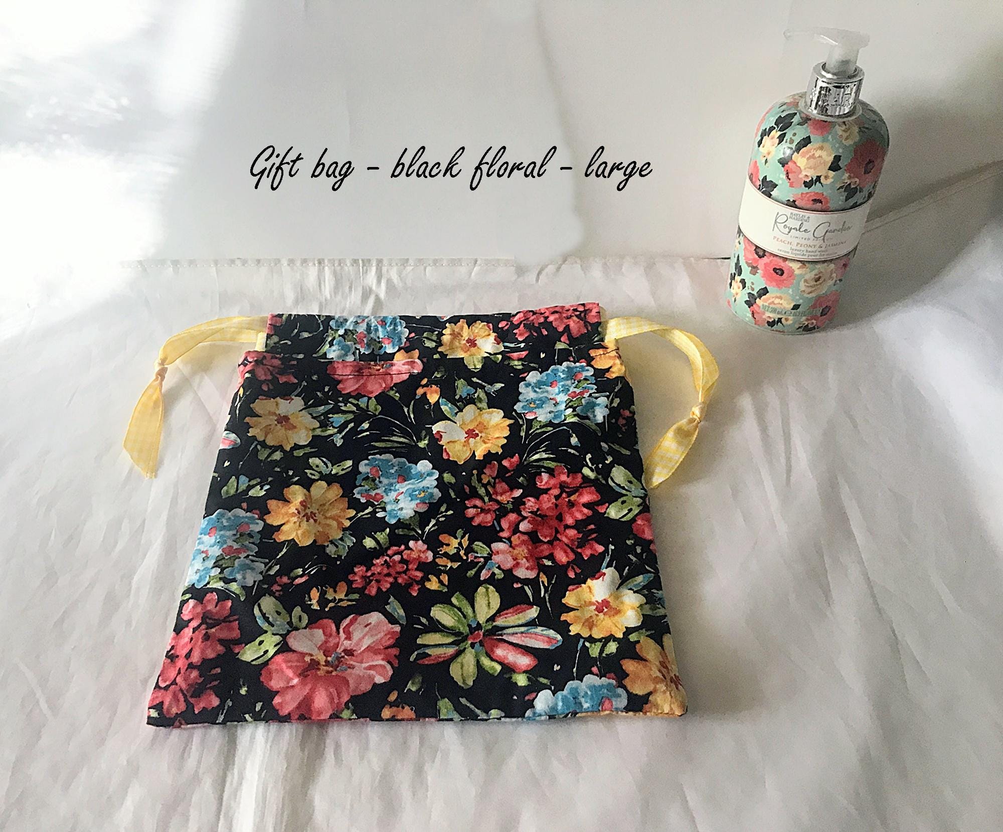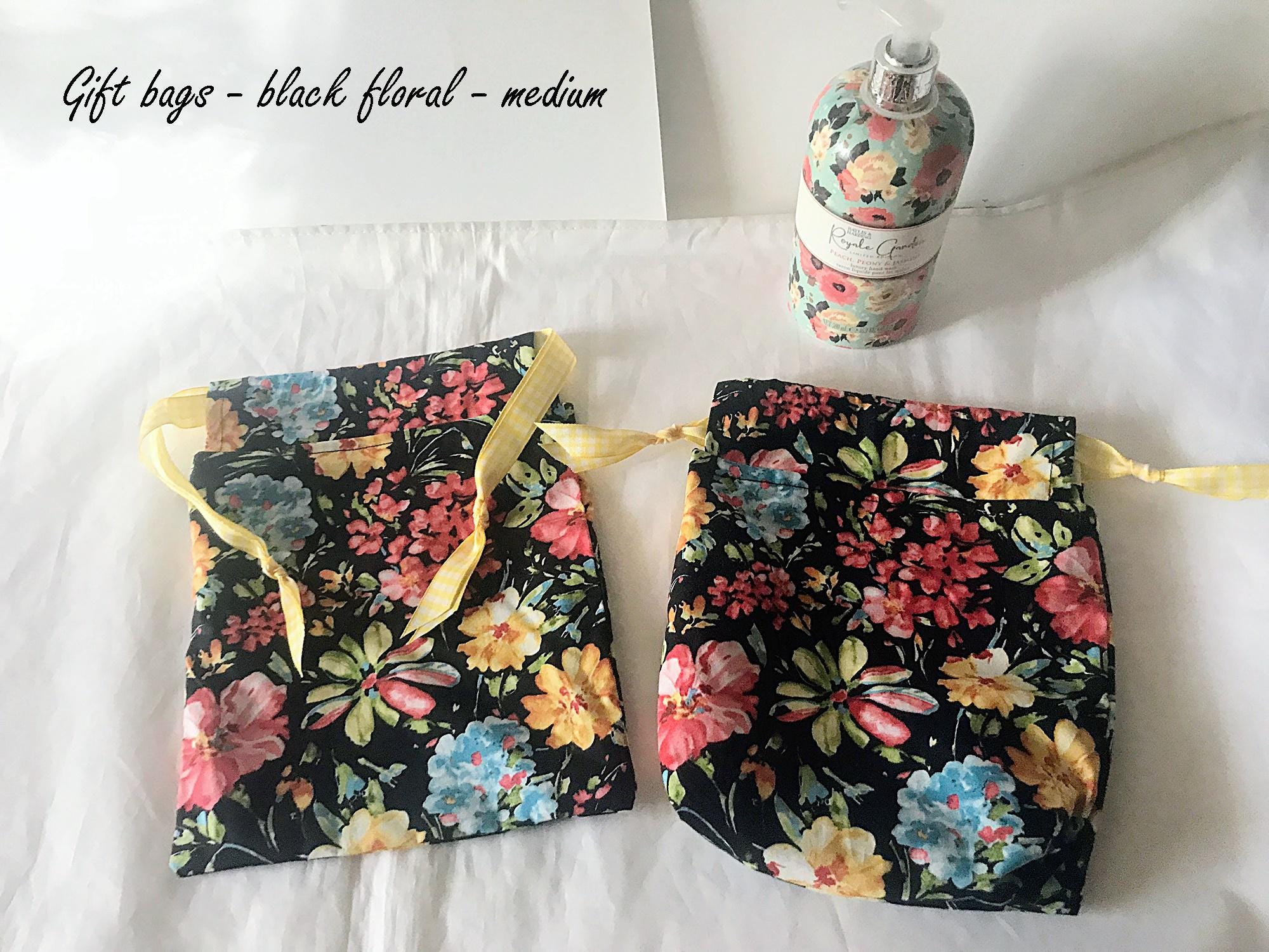 Black Floral Drawstring Gift Bags - Reusable Eco-Friendly Lined Cotton Bag, Handmade Yorkshire