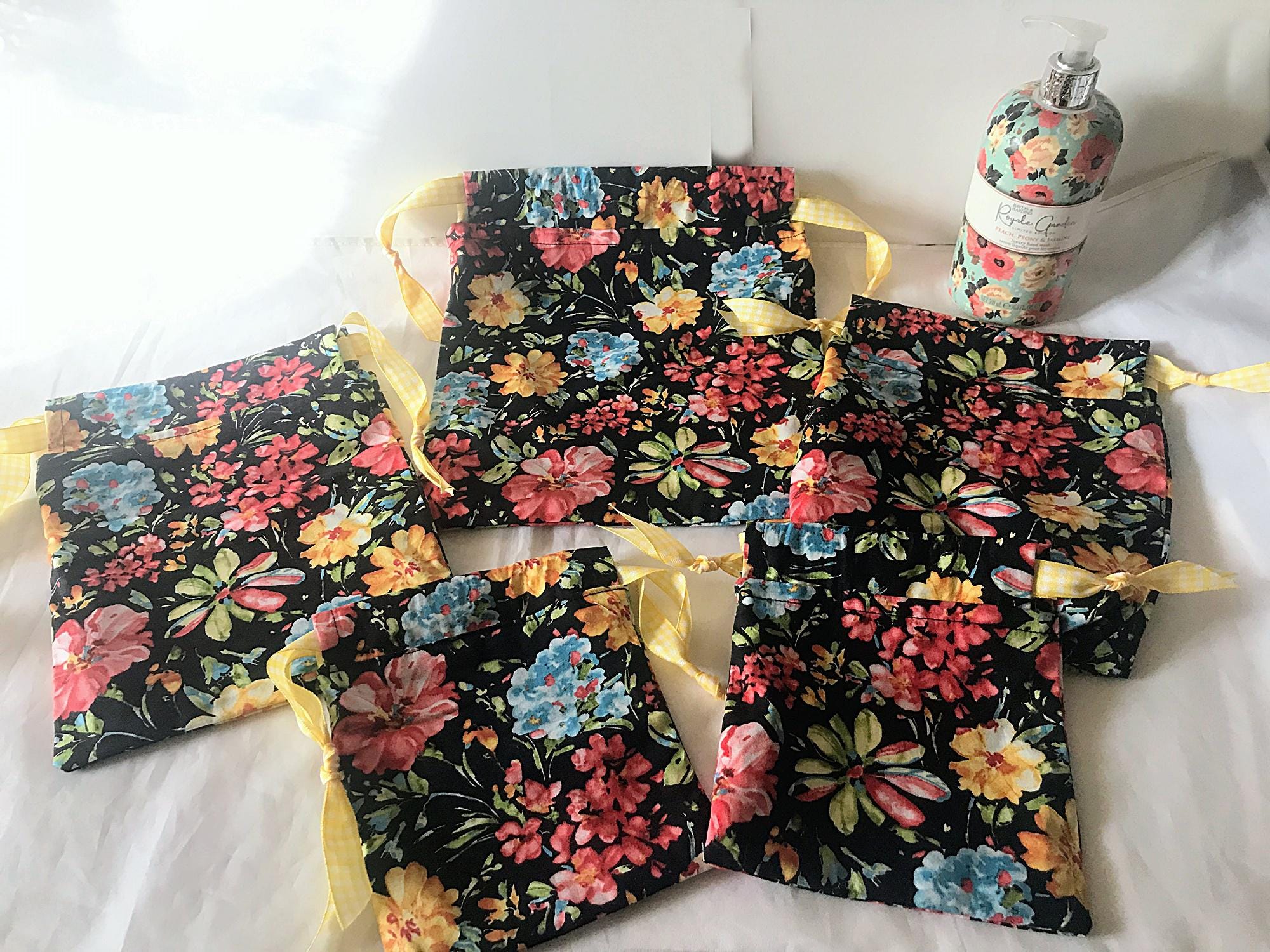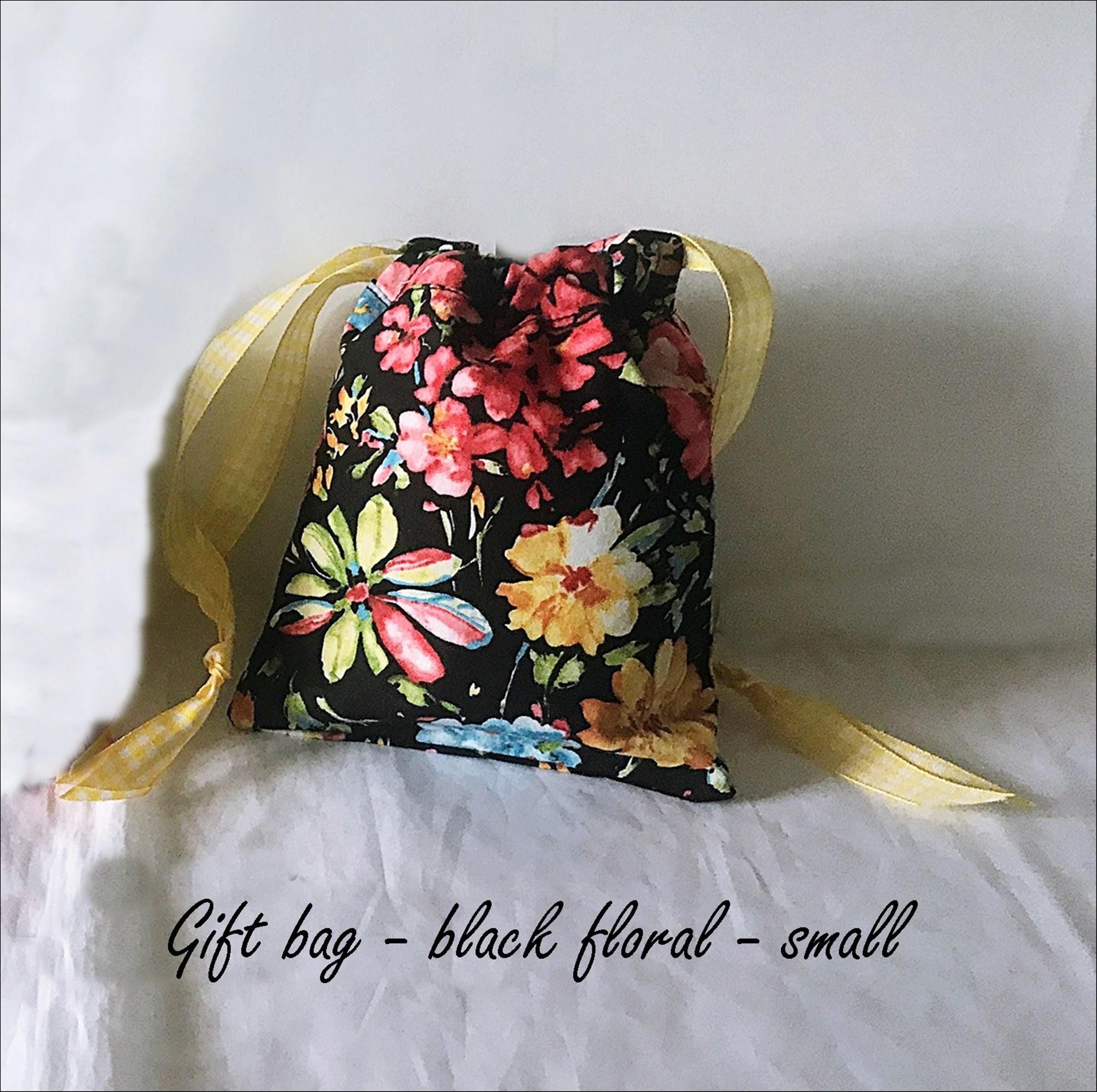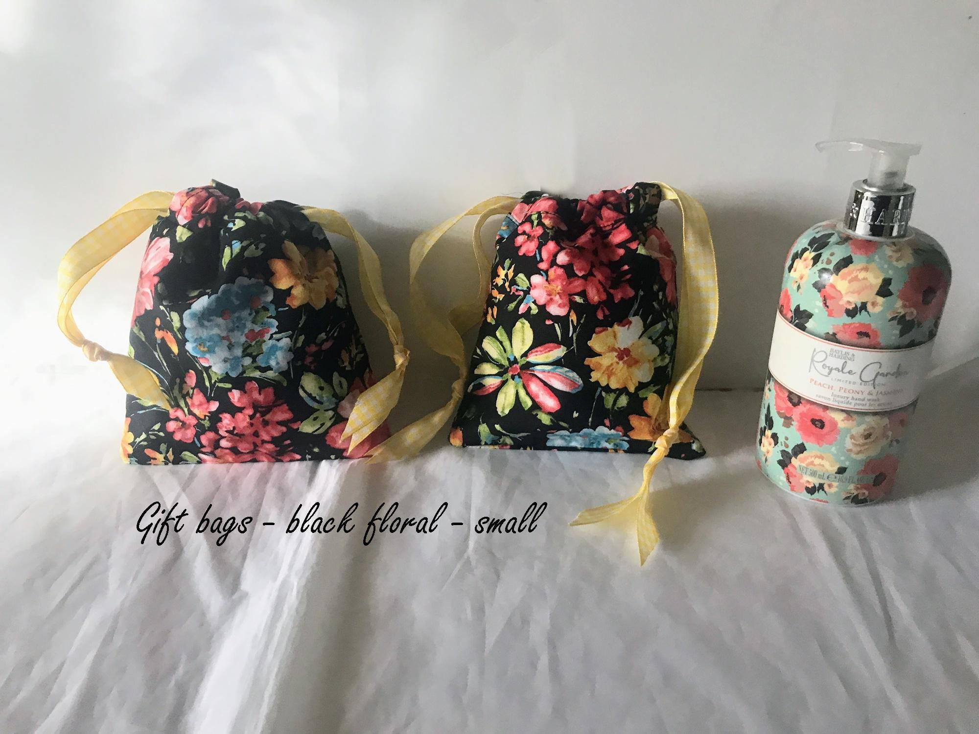 Black Floral Drawstring Gift Bags - Reusable Eco-Friendly Lined Cotton Bag, Handmade Yorkshire