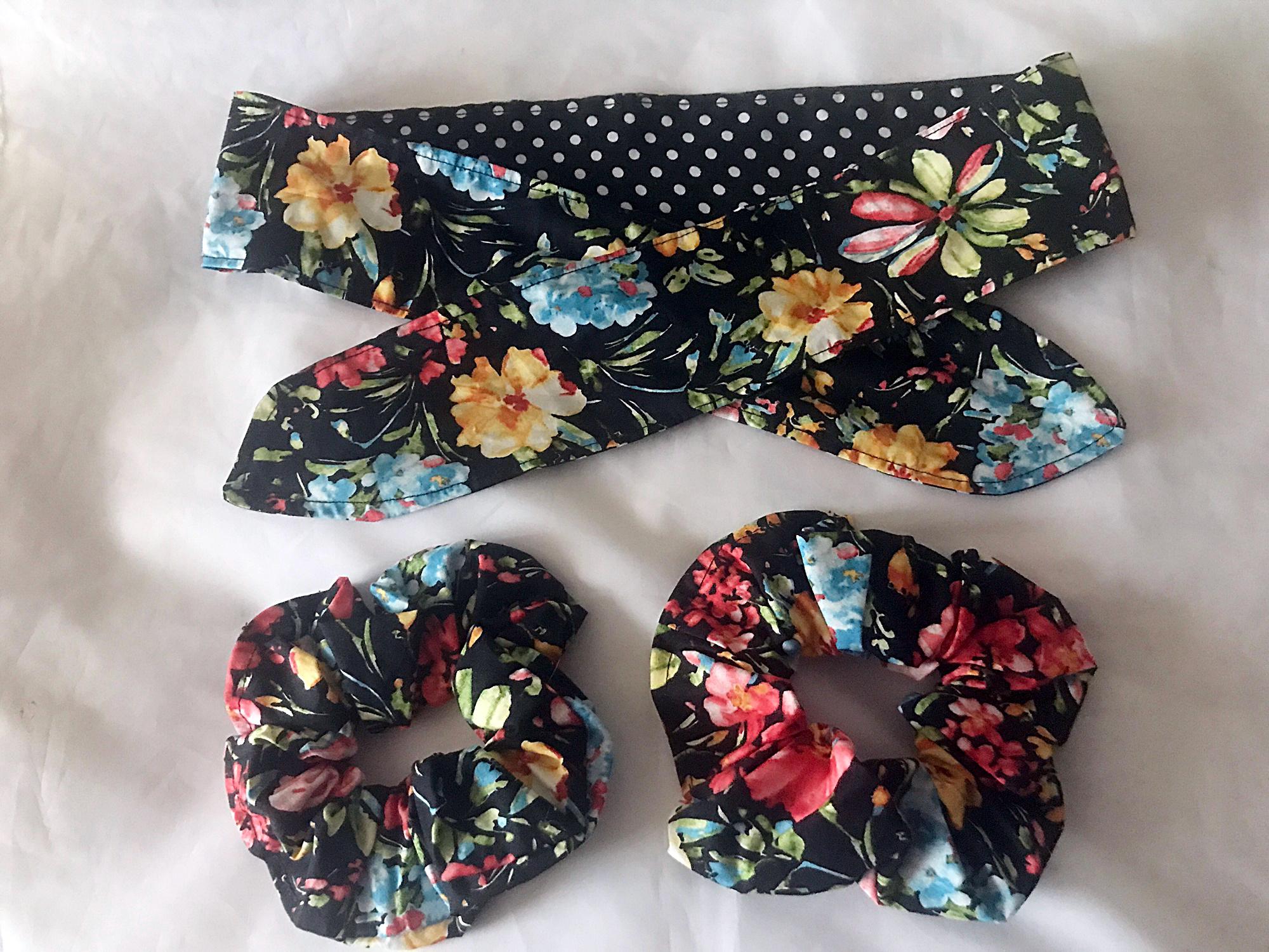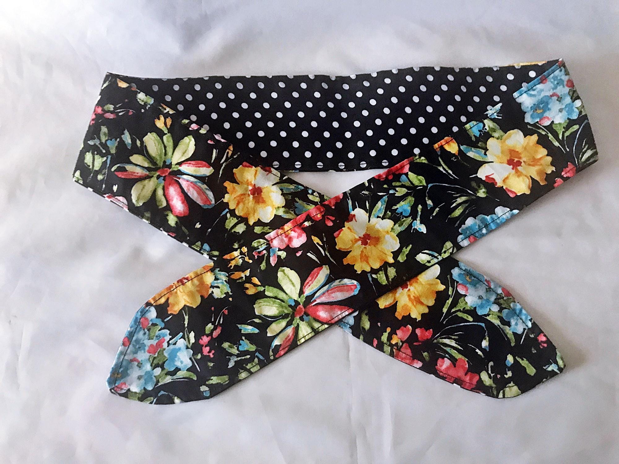 Black Floral Polka Dot Reversible Self Tie Headband, Scrunchie, Black Floral, Polka Dot Make Up Brus
