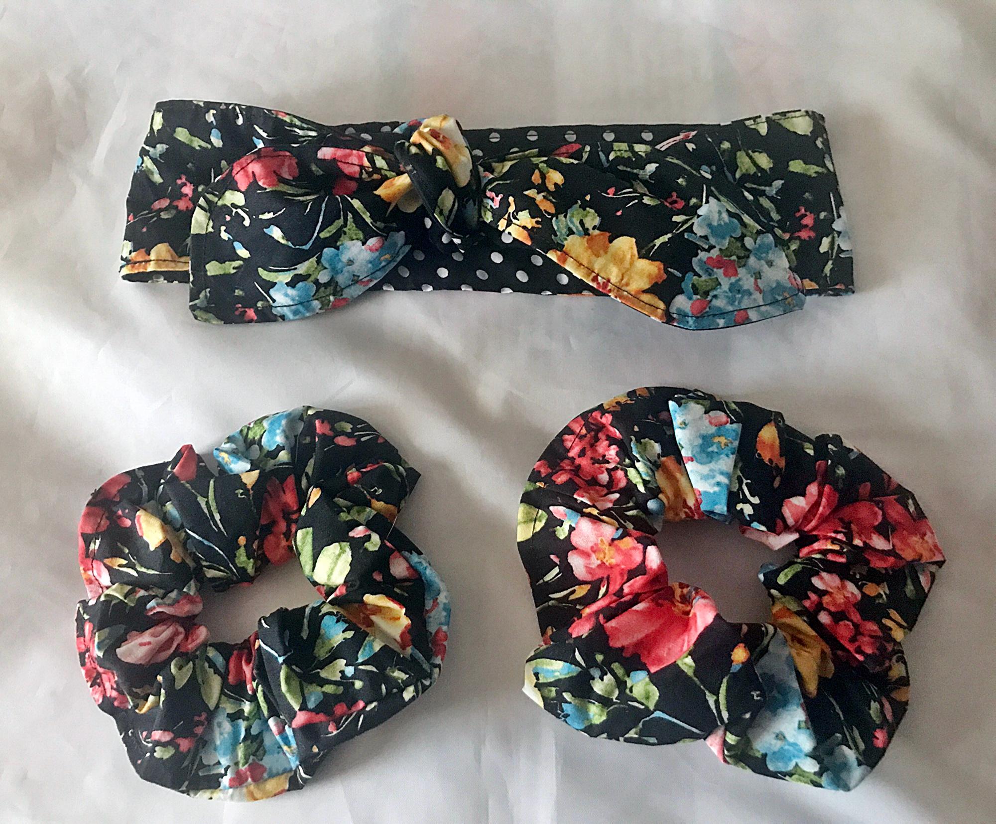 headbands and scrunchies are made by reusing remnants left from other projects.