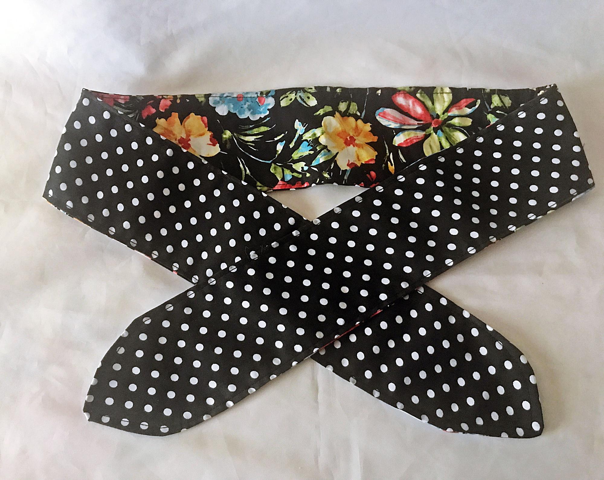 Self tie headband, black floral print cotton fabric, black polka dot fabric on one side, making a reversible hair accessory.