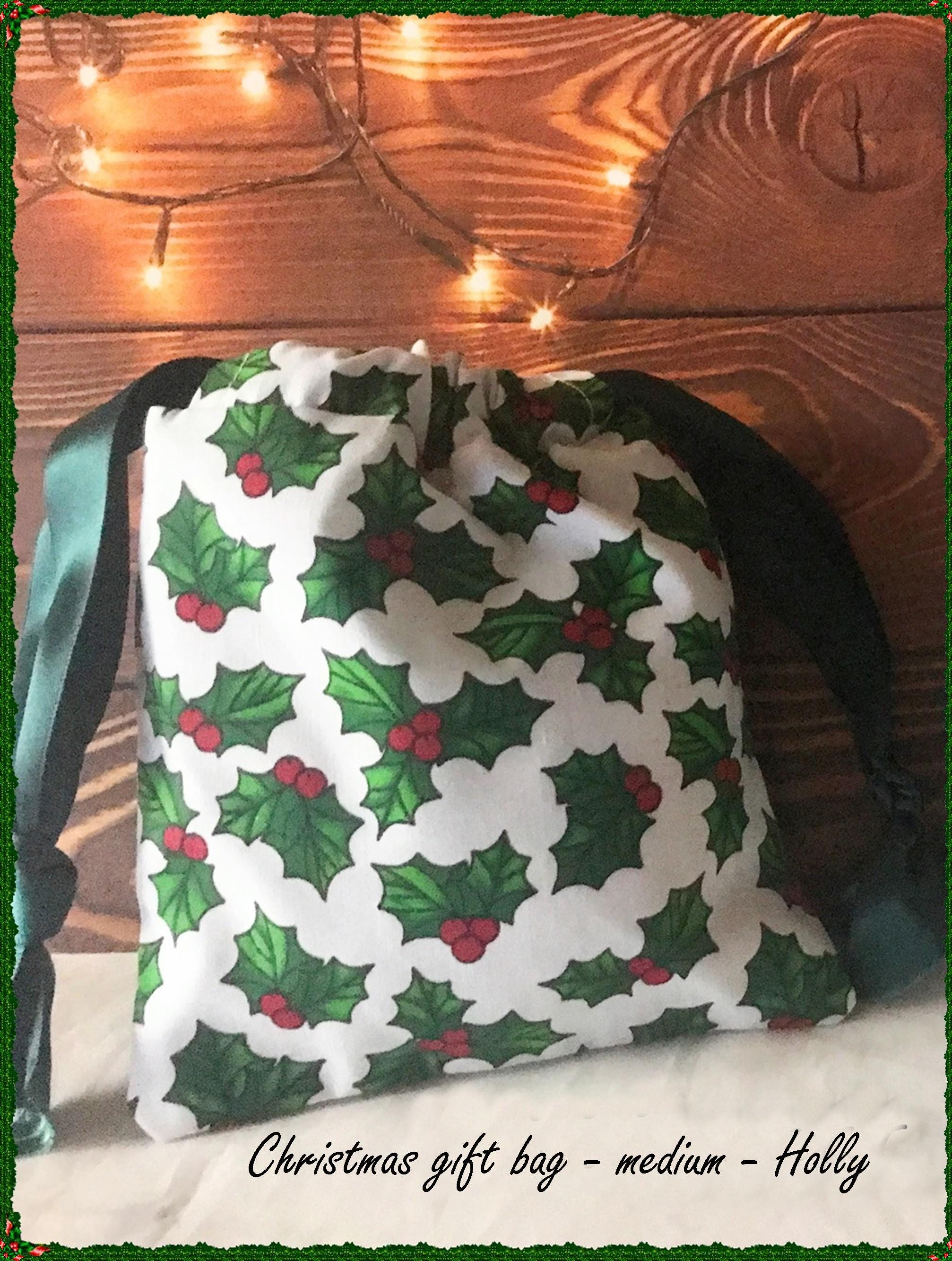 Christmas gift bags, eco-friendly, drawstring cotton fabric gift bags, print cotton fabrics, lined in cream fabric, reusable storage bag medium- size - height = 8" inches, wide = 10" inches x1 - red - snowflakes x1 - green - holly large - height = 10" inches x 8" wide x 1 reindeer x 1 green trees **Pattern - Miss Freckles Design** For more Christmas items, just click this link https://www.etsy.com/uk/shop/SolsticeDays?sort_order=price_asc&search_query=christmas **Handmade in Yorkshire from a smoke free home** <<>> Items are sent Tracked 48 using Royal Mail, shipping within the UK, excluding Northern Ireland & EU