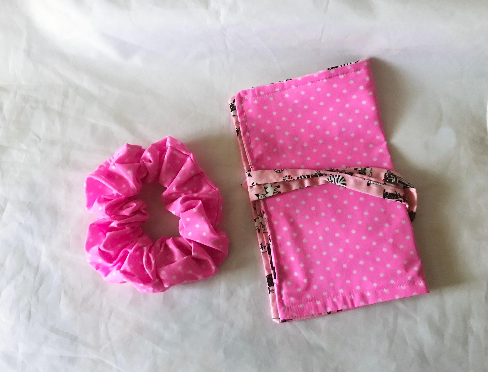 Pink cat roll up pencil case for kids, cotton fabric pen organiser, Handmade