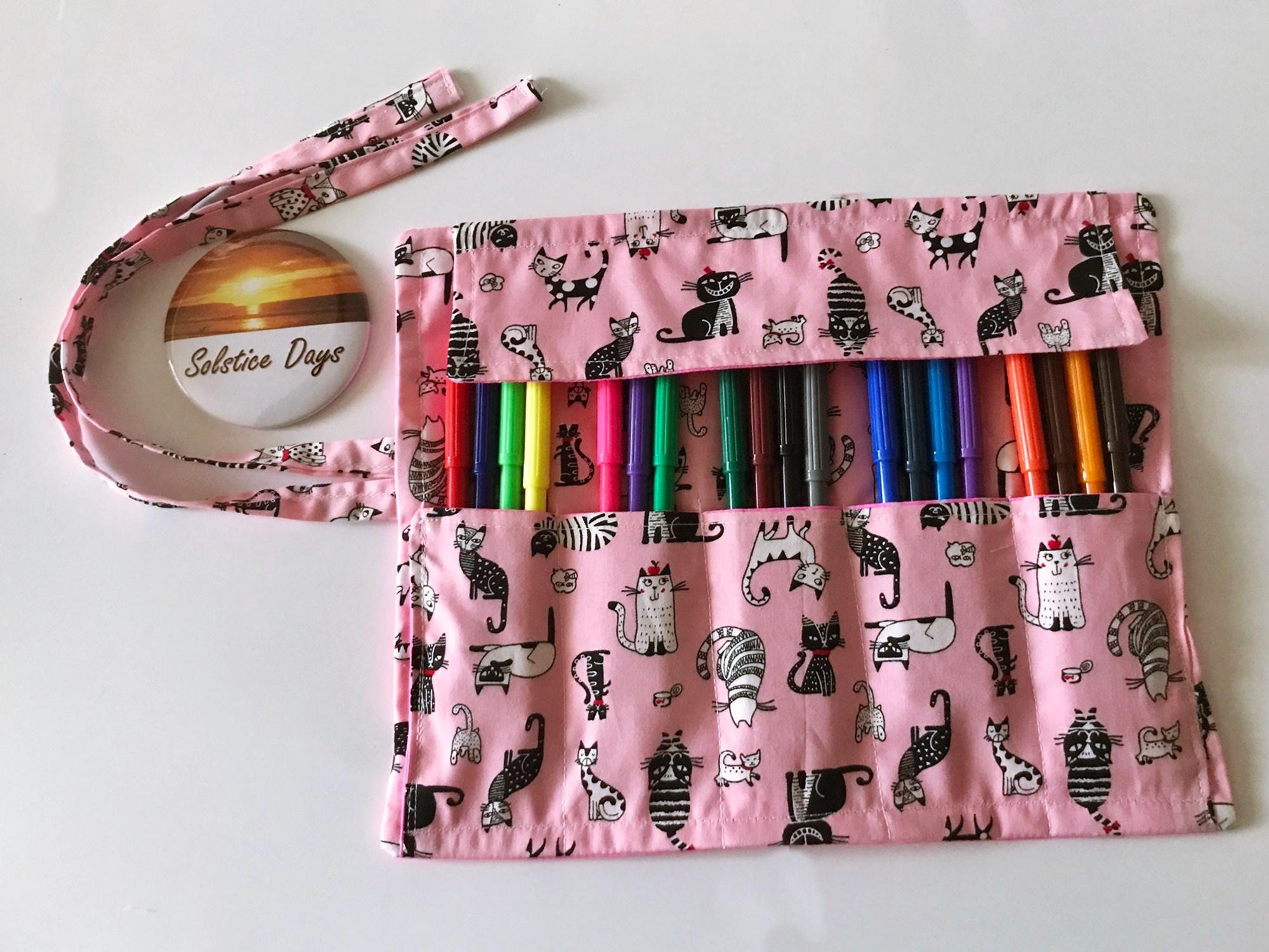 pencil case - roll pencil pouch - cats pencil case - pink roll up pencil storage - pen holder - tie fastening pencil pouch - pink pencil case - back to school kids pencil case - handmade pencil roll