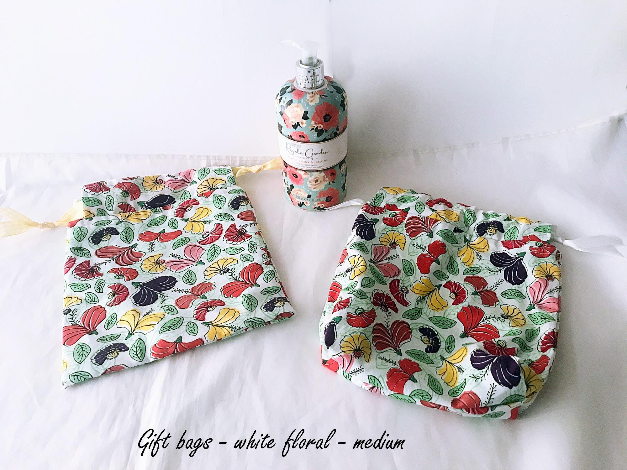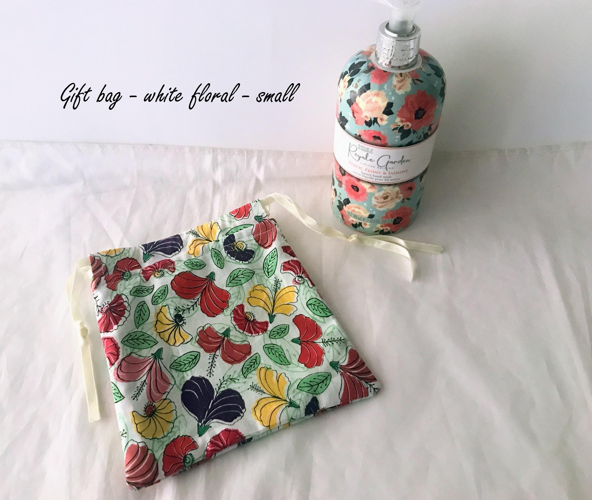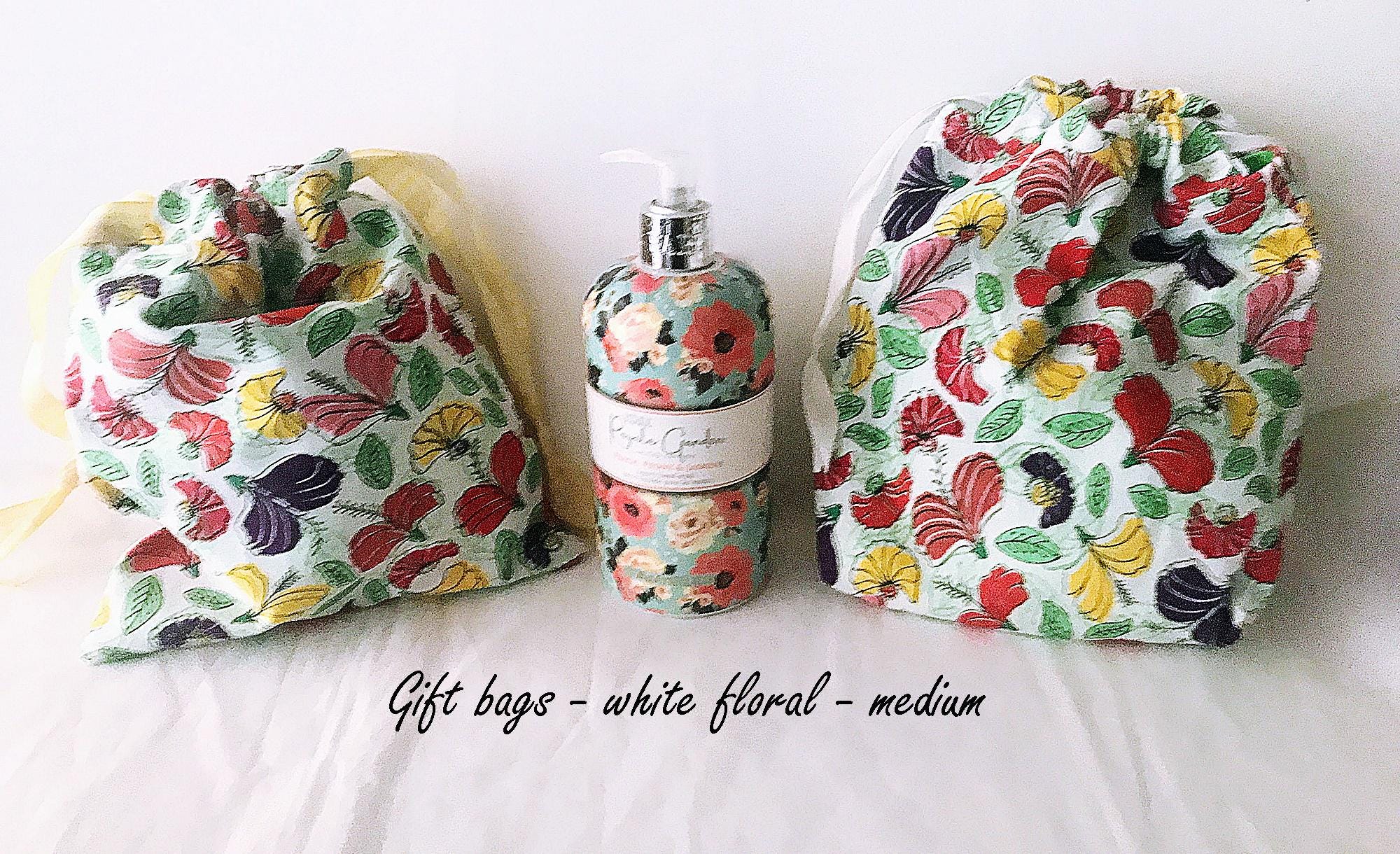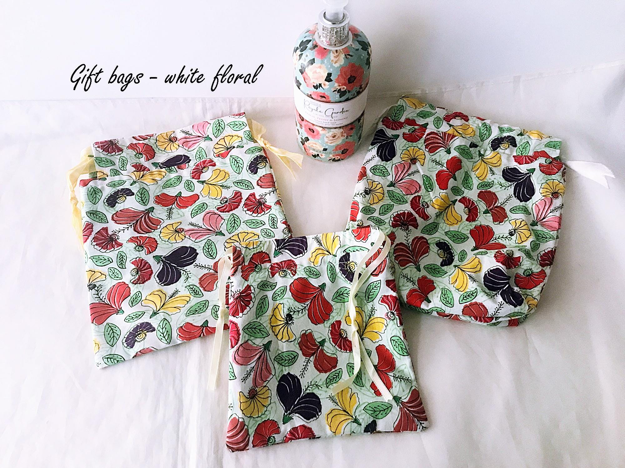 White Floral Gift Bags - Drawstring Reusable Fabric Gift Bags, Small and Medium Eco-Friendly Lined C