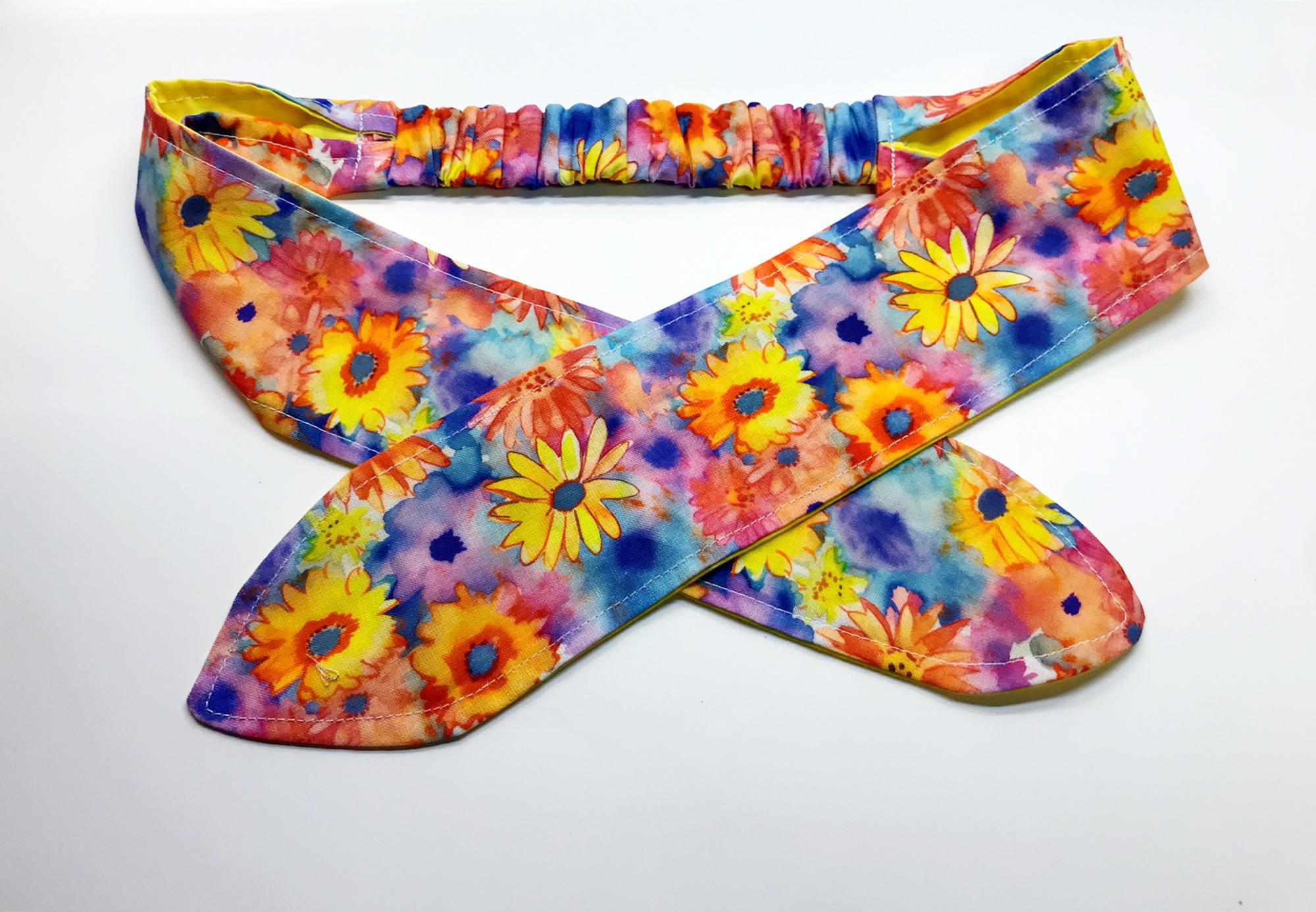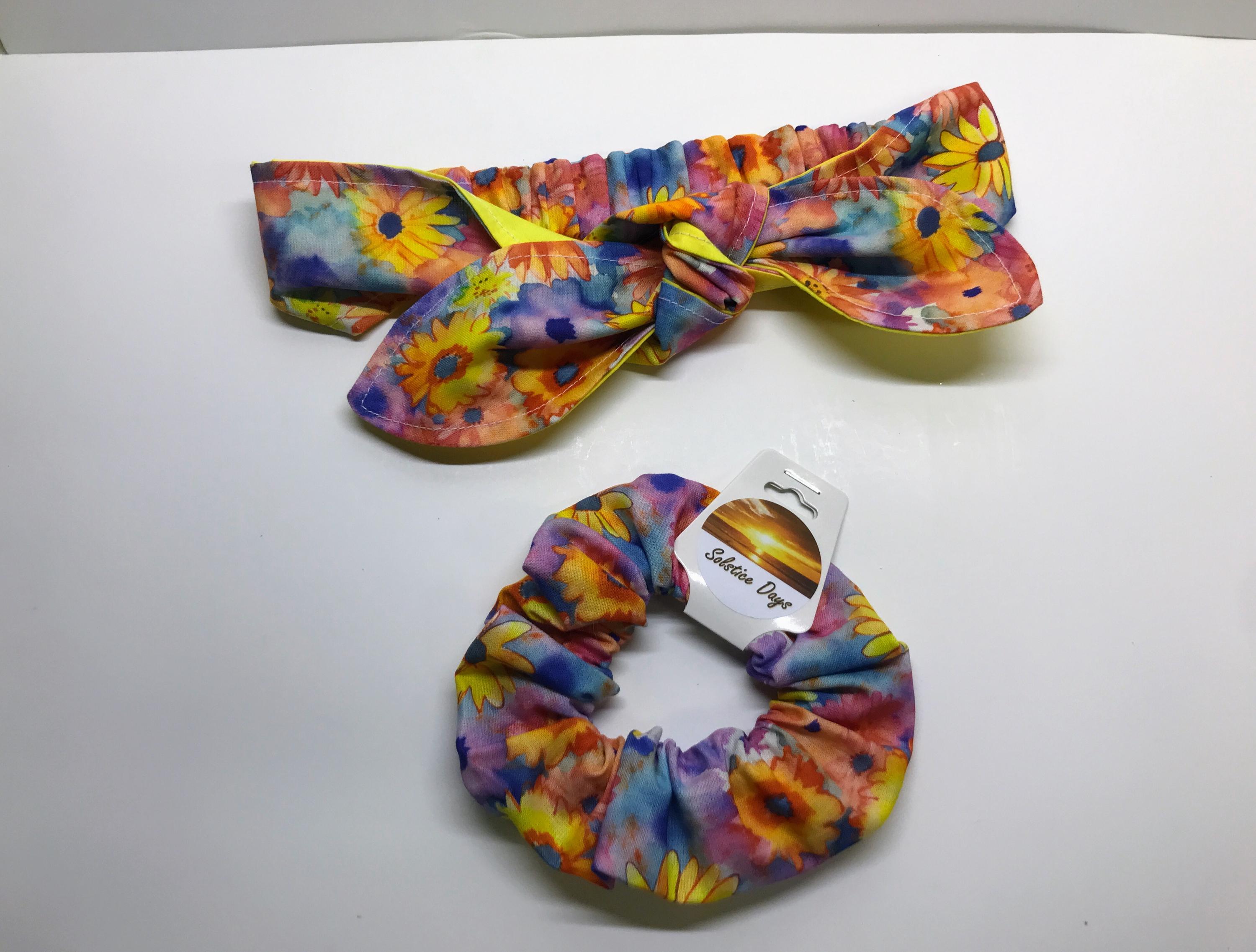 Yellow tie headband and floral scrunchie made from yellow floral print cotton fabric