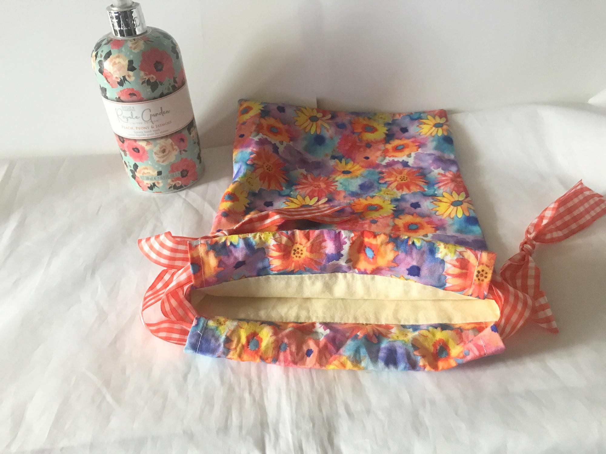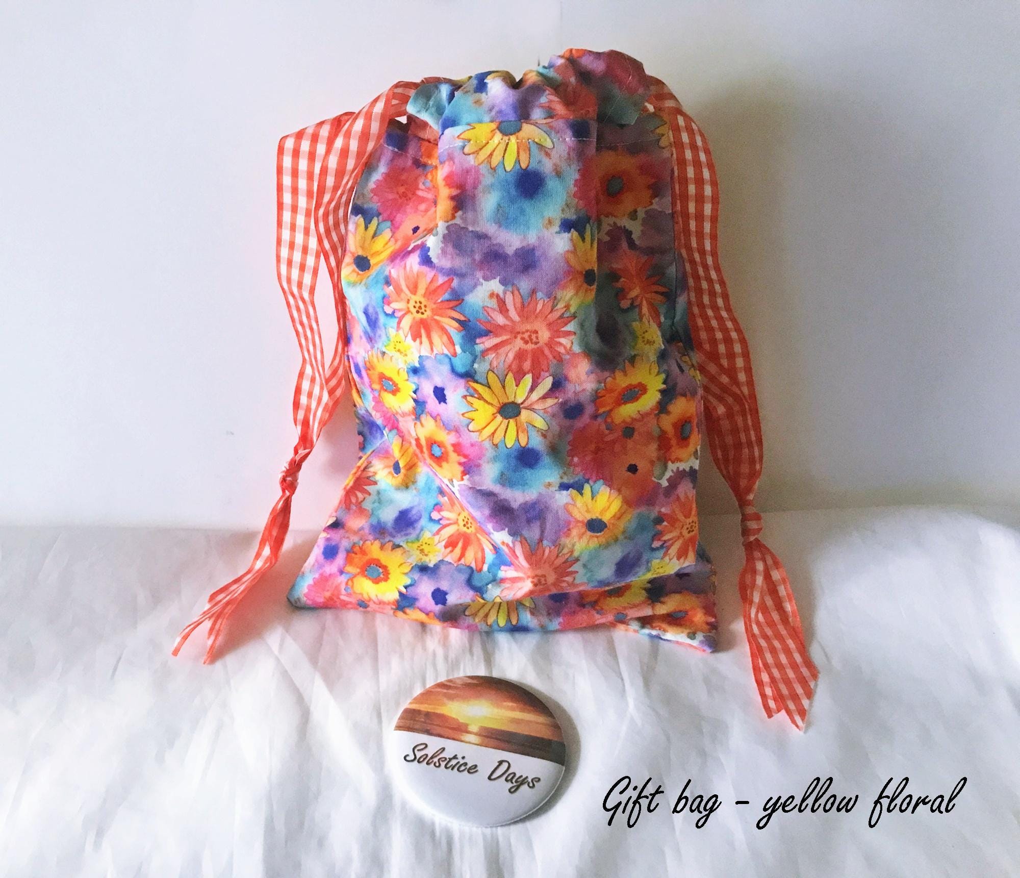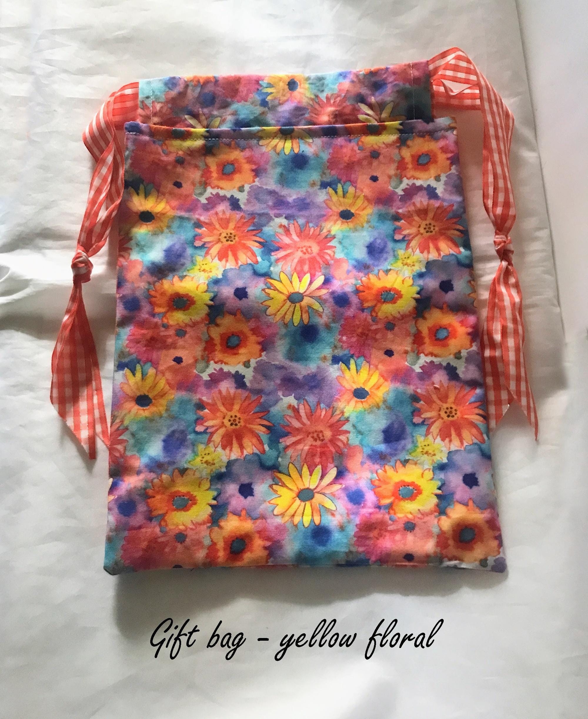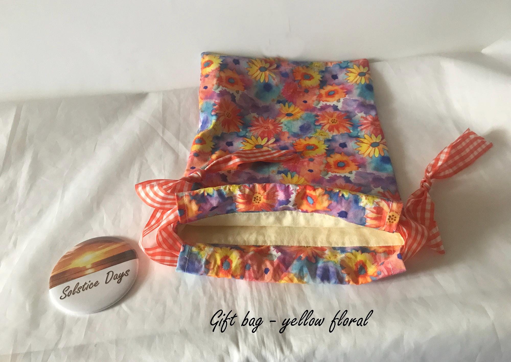 Yellow floral fabric gift bag, reusable cotton fabric bag, lined in yellow cotton fabric Top stitch detail and orange ribbon drawstrings Folds flat for storage , letterbox gift ready to post **SIZE** - 10" x 8" inches **Any queries? Please read my FAQ for information** **made by J Penney/Solstice Days, Yorkshire - Handmade Items from a smoke free home, thanks for visiting my online shop** <<>> Items are sent Tracked 48 postage using Royal Mail and shipping to England, Scotland and Wales only. If you are based in Northern Ireland, please note that I am unable to accept orders due to new General Product Safety Regulations (GPSR 2024).