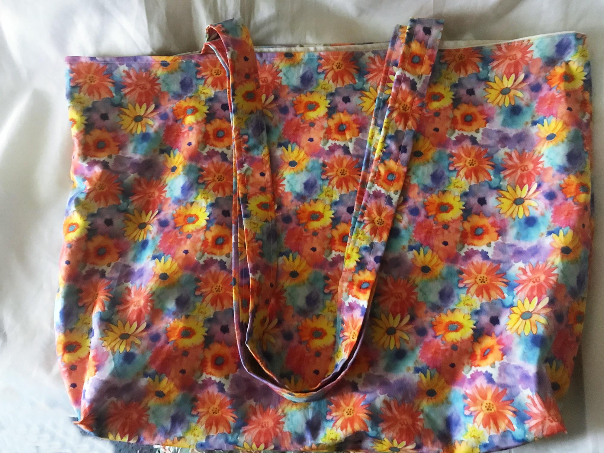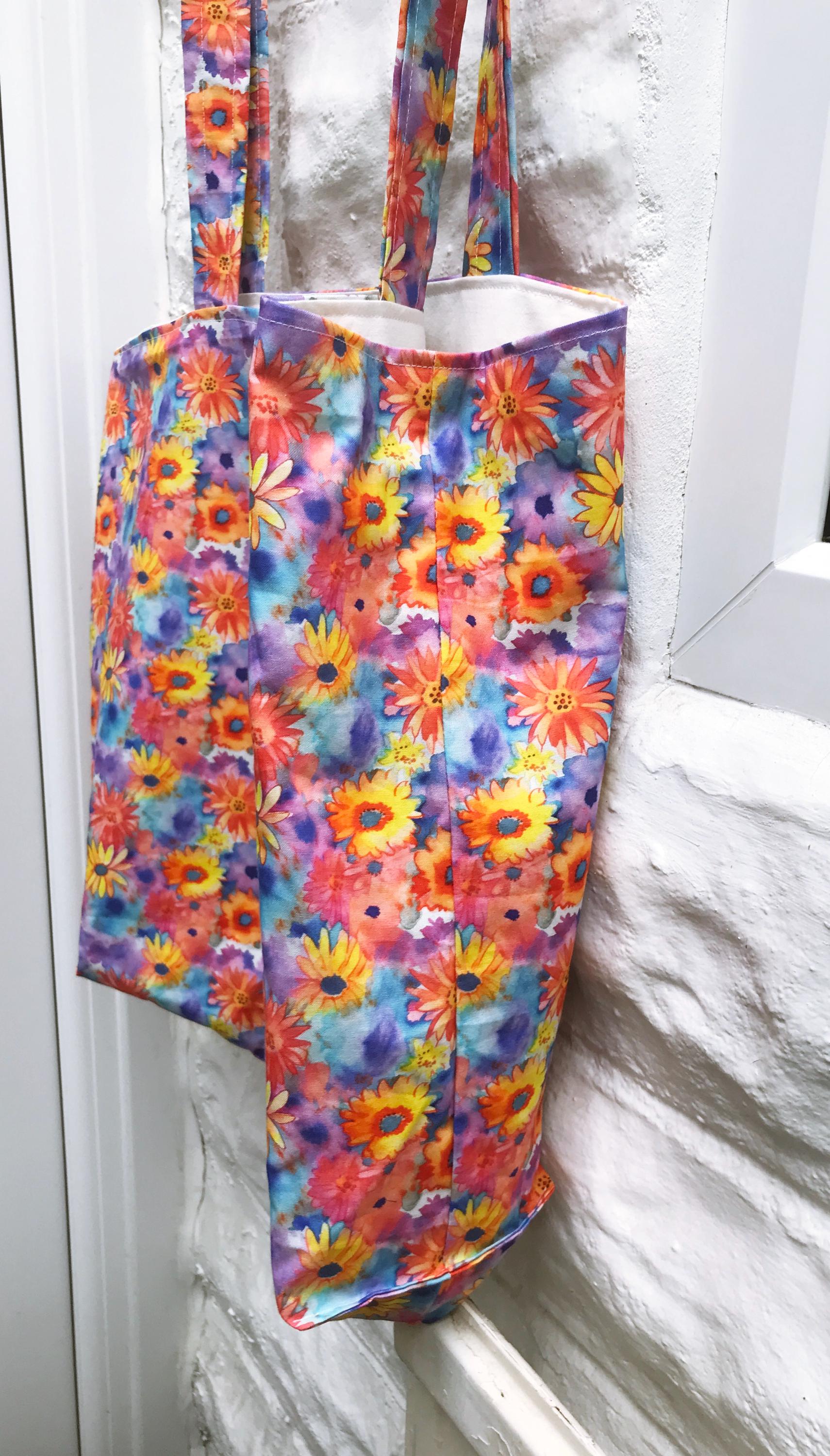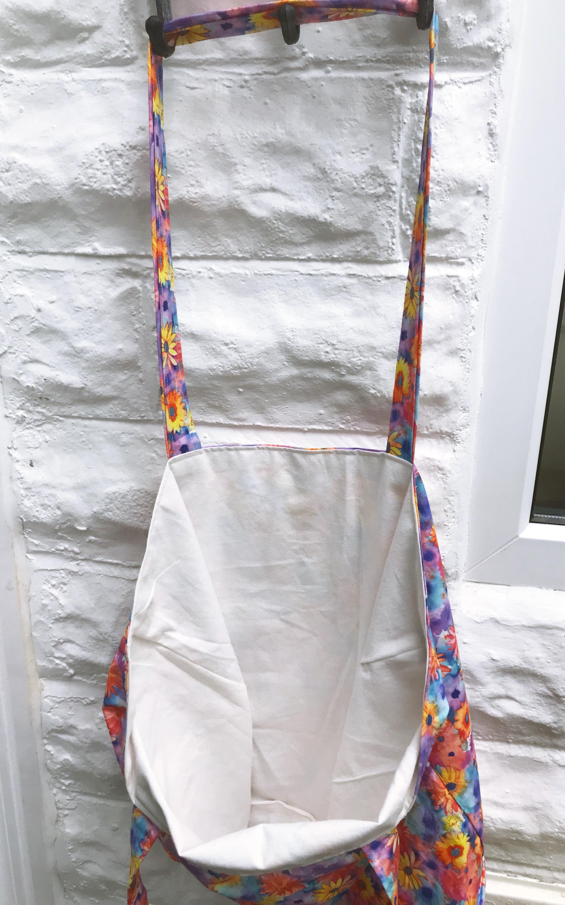 Shoulder bag, handmade from yellow floral print cotton fabric, lined in cream cotton fabric.