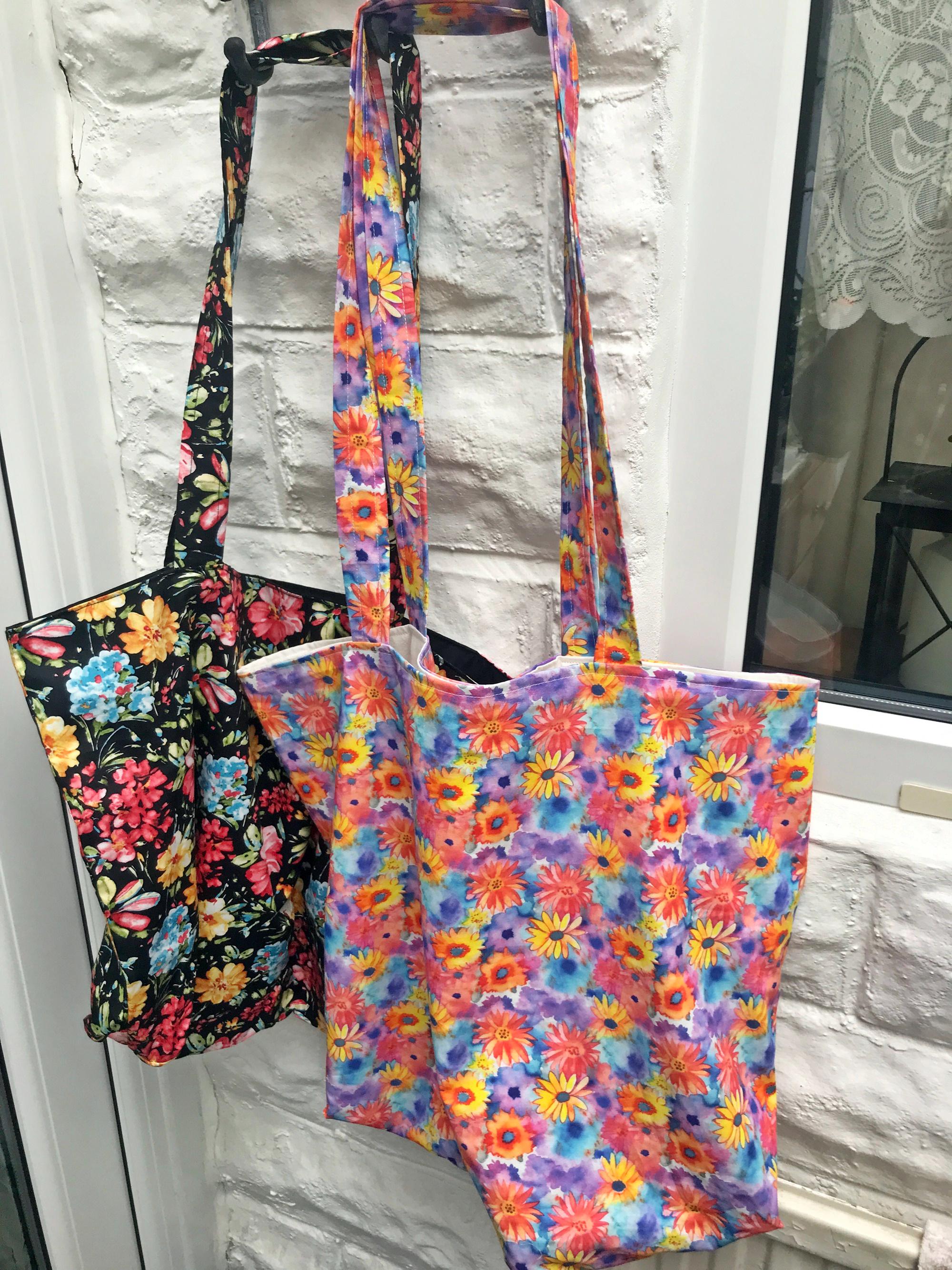 Eco friendly bags handmade from yellow floral print cotton fabric. Reusable bags to keep plastic bags out of landfill. Easily folded to keep handy